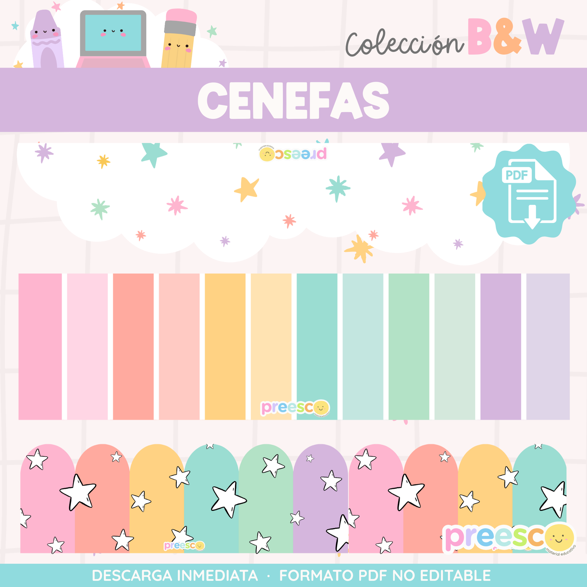Material educativo compuesto por cenefas decorativas diseñadas como referentes visuales para ambientar y delimitar espacios dentro del aula de manera atractiva y funcional.